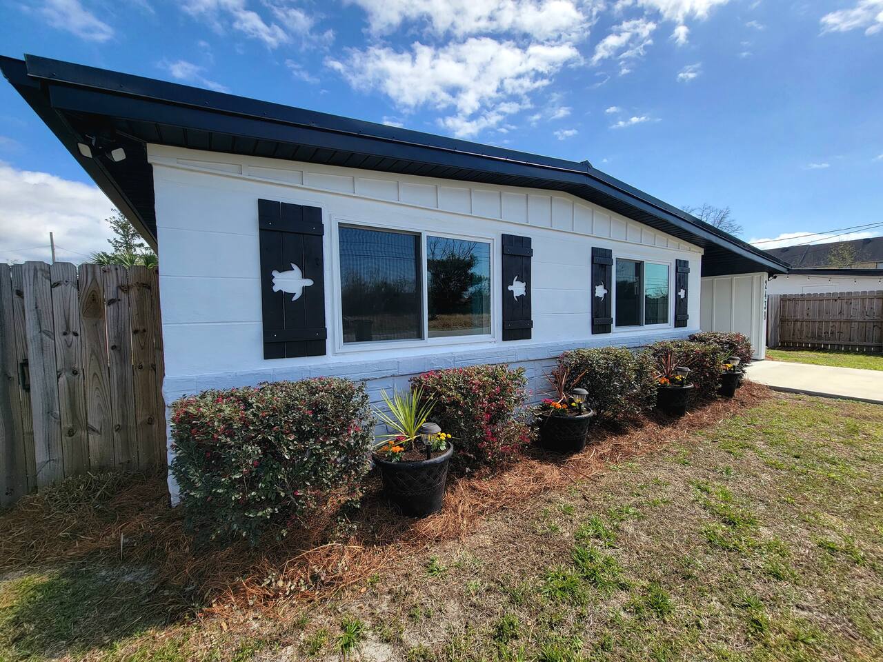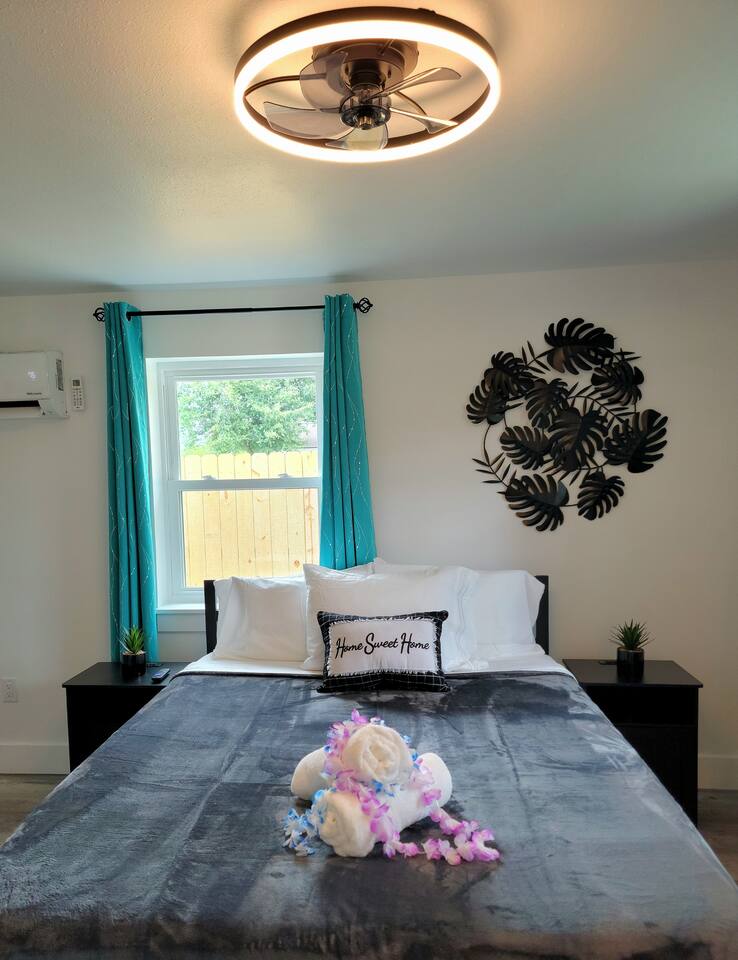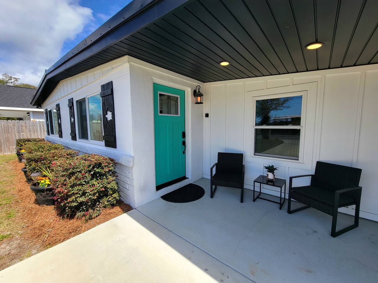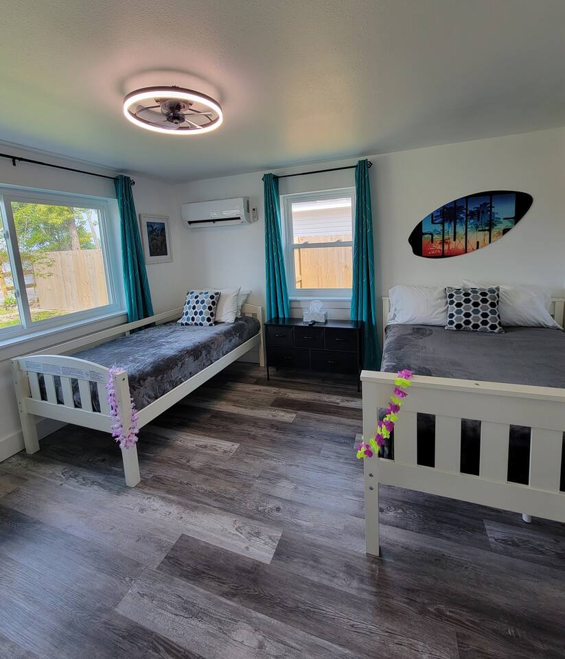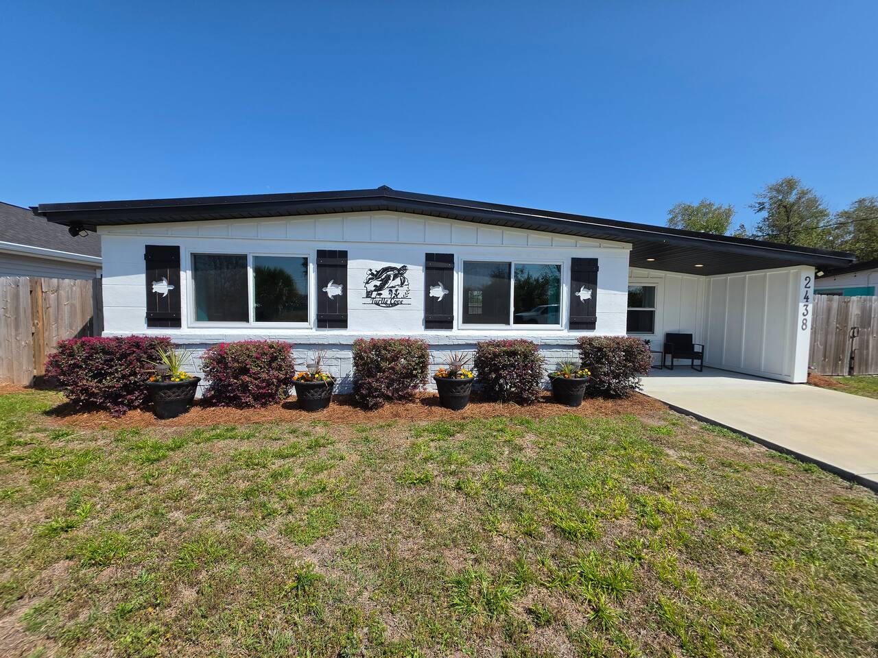 🐢 Turtle Cove Beach Retreat – ⭐ Modern Coastal Cottage in Panama City! 🏡 As You Arrive • Eye-catching modern beach cottage with black, grey, and teal accents • Hand-crafted sea turtle shutters add a local, artistic flair • Lush landscaping with flowers and shrubs creates a welcoming vibe • Ample driveway parking for you and your guests 🛋️ Living Room Open-concept layout flowing into the kitchen • 65" Smart TV and cozy gray sectional with queen memory foam pull-out bed • Large window for natural light and front yard views • Dedicated temperature control for comfort • Decorated with indoor plants and beachy accents 🍽️ Kitchen • Modern with black brushed granite countertops and stainless steel Whirlpool appliances • Unique surfboard light fixture adds coastal character • Chop block floating shelves for storage • Fully stocked for all your cooking needs — from spices to cookware 🛏️ Master Bedroom • Cozy and stylish with a queen memory foam mattress • 50" Smart TV and small work desk • Private temperature control • Decorated with turtle & beach-themed art 🛏️ Guest Bedroom • Two beds, one full and one Twin bed Both have very comfy mattresses • 50" Smart TV with HBO Max included • Private temperature control • Serene turtle and beach decor 🛁 Bathroom • Spacious with a double vanity and modern rain shower & soaking tub • Sleek black fixtures and touch-screen lighted mirror • Recessed lighting and turtle-themed details for a spa-like feel 🧺 Laundry Room & Game Space • Equipped with Samsung front-load washer & dryer • Bonus: Retro arcade machine with 300+ classic games for 1–2 players 🍴 Outdoor Dining Area • Shaded by a sun sail, surrounded by natural greenery and stone • Handmade picnic table under string lights • Propane grill for unforgettable meals 🔥 Outdoor Fireplace • Stone path leads to a cozy firepit with bench seating • Surrounded by privacy fencing for a secluded oasis 🐚 Modern Touches & Local Charm • Thoughtfully designed with modern beach cottage style • Sea turtle theme runs throughout for a fun, local vibe • The perfect escape for relaxation, connection, and memories 📅 Ready to book? Come relax, reset, and enjoy a one-of-a-kind stay at Turtle Cove