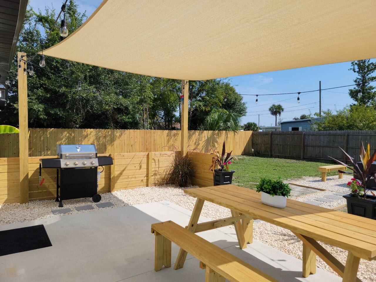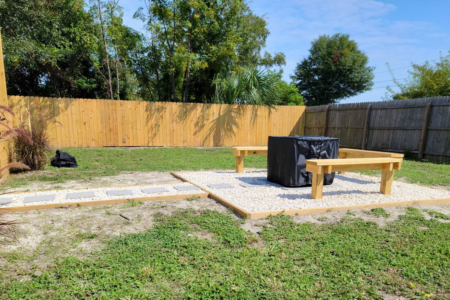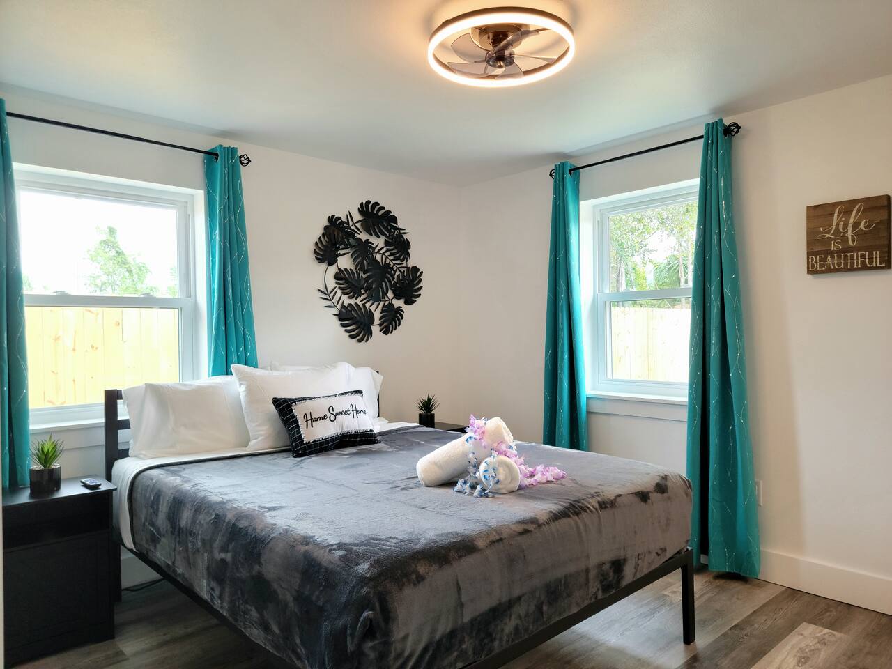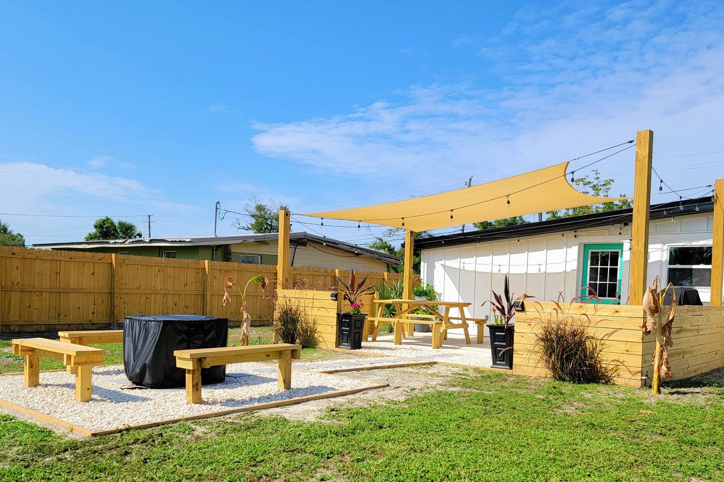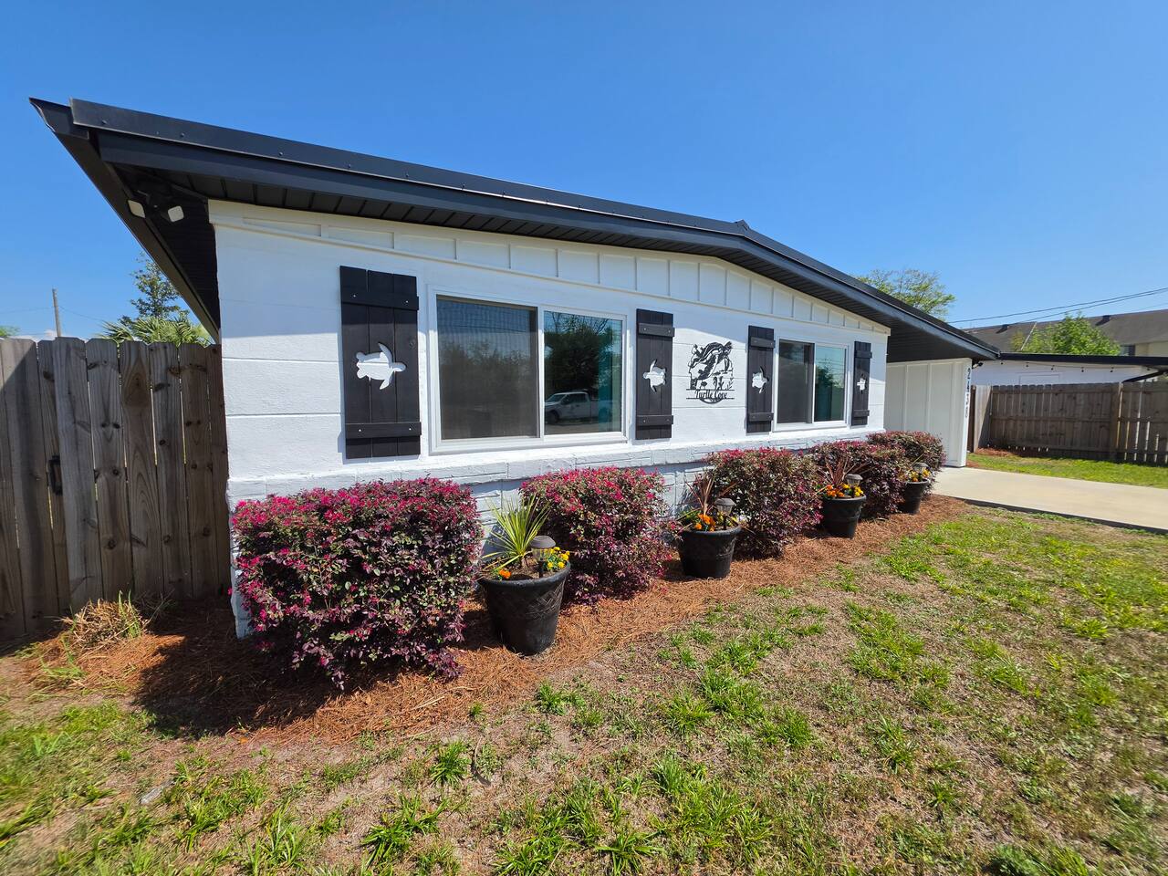 🐢 Turtle Cove Beach Retreat – ⭐ Modern Coastal Cottage in Panama City! 🏡 As You Arrive • Eye-catching modern beach cottage with black, grey, and teal accents • Hand-crafted sea turtle shutters add a local, artistic flair • Lush landscaping with flowers and shrubs creates a welcoming vibe • Ample driveway parking for you and your guests 🛋️ Living Room Open-concept layout flowing into the kitchen • 65" Smart TV and cozy gray sectional with queen memory foam pull-out bed • Large window for natural light and front yard views • Dedicated temperature control for comfort • Decorated with indoor plants and beachy accents 🍽️ Kitchen • Modern with black brushed granite countertops and stainless steel Whirlpool appliances • Unique surfboard light fixture adds coastal character • Chop block floating shelves for storage • Fully stocked for all your cooking needs — from spices to cookware 🛏️ Master Bedroom • Cozy and stylish with a queen memory foam mattress • 50" Smart TV and small work desk • Private temperature control • Decorated with turtle & beach-themed art 🛏️ Guest Bedroom • Two beds, one full and one Twin bed Both have very comfy mattresses • 50" Smart TV with HBO Max included • Private temperature control • Serene turtle and beach decor 🛁 Bathroom • Spacious with a double vanity and modern rain shower & soaking tub • Sleek black fixtures and touch-screen lighted mirror • Recessed lighting and turtle-themed details for a spa-like feel 🧺 Laundry Room & Game Space • Equipped with Samsung front-load washer & dryer • Bonus: Retro arcade machine with 300+ classic games for 1–2 players 🍴 Outdoor Dining Area • Shaded by a sun sail, surrounded by natural greenery and stone • Handmade picnic table under string lights • Propane grill for unforgettable meals 🔥 Outdoor Fireplace • Stone path leads to a cozy firepit with bench seating • Surrounded by privacy fencing for a secluded oasis 🐚 Modern Touches & Local Charm • Thoughtfully designed with modern beach cottage style • Sea turtle theme runs throughout for a fun, local vibe • The perfect escape for relaxation, connection, and memories 📅 Ready to book? Come relax, reset, and enjoy a one-of-a-kind stay at Turtle Cove