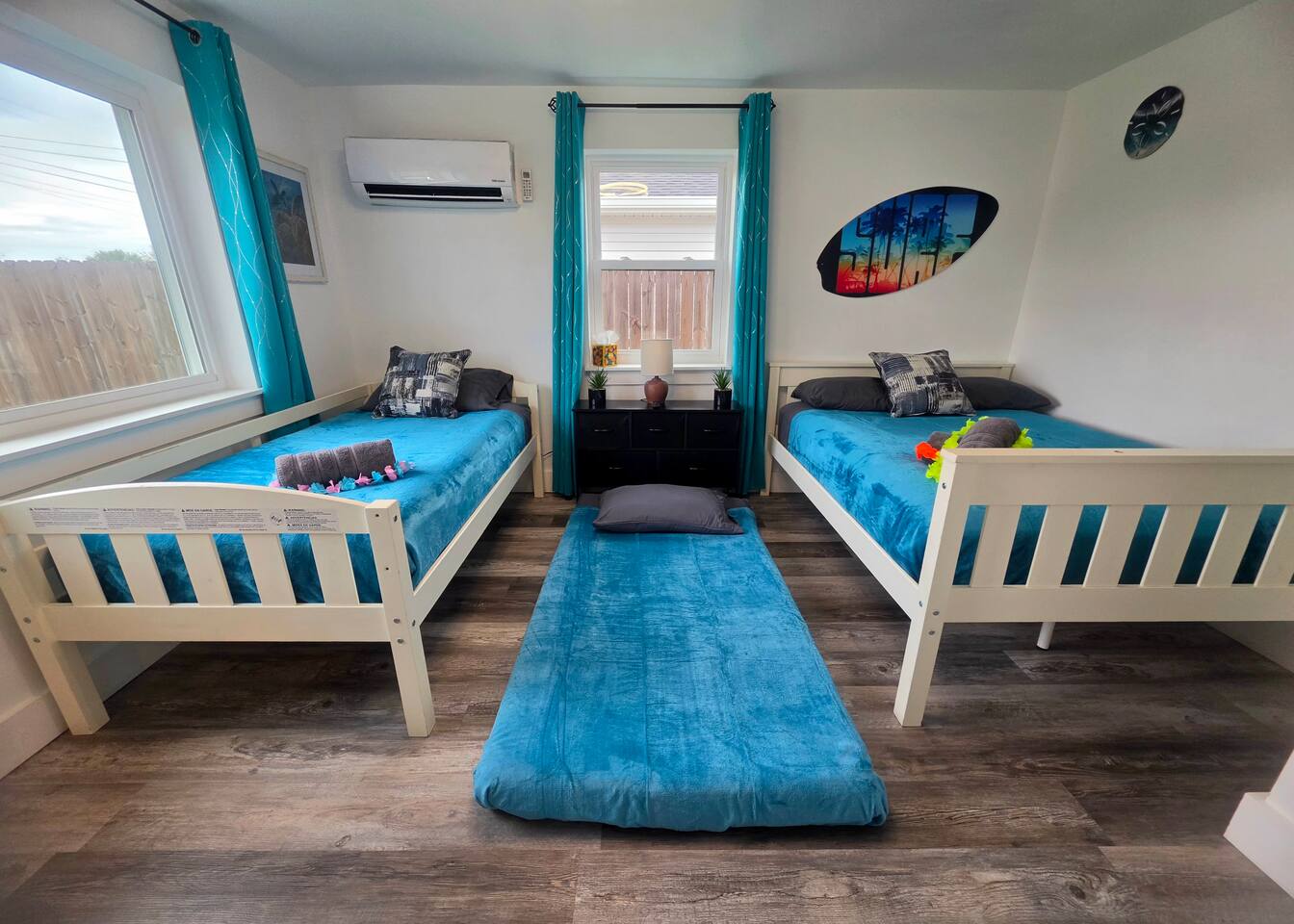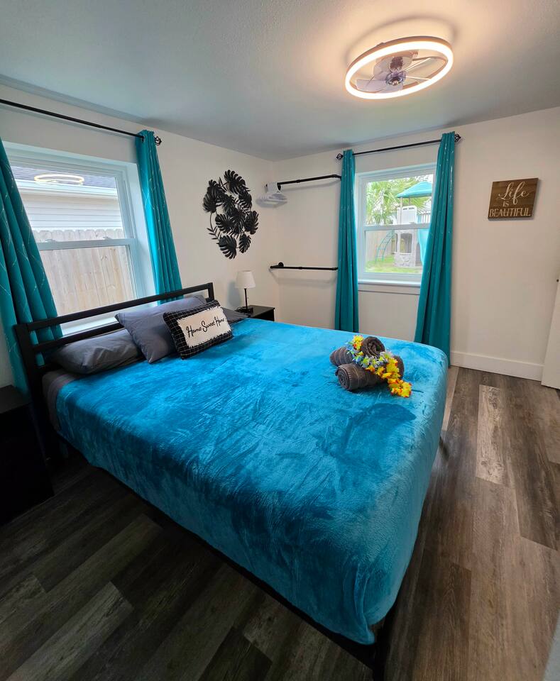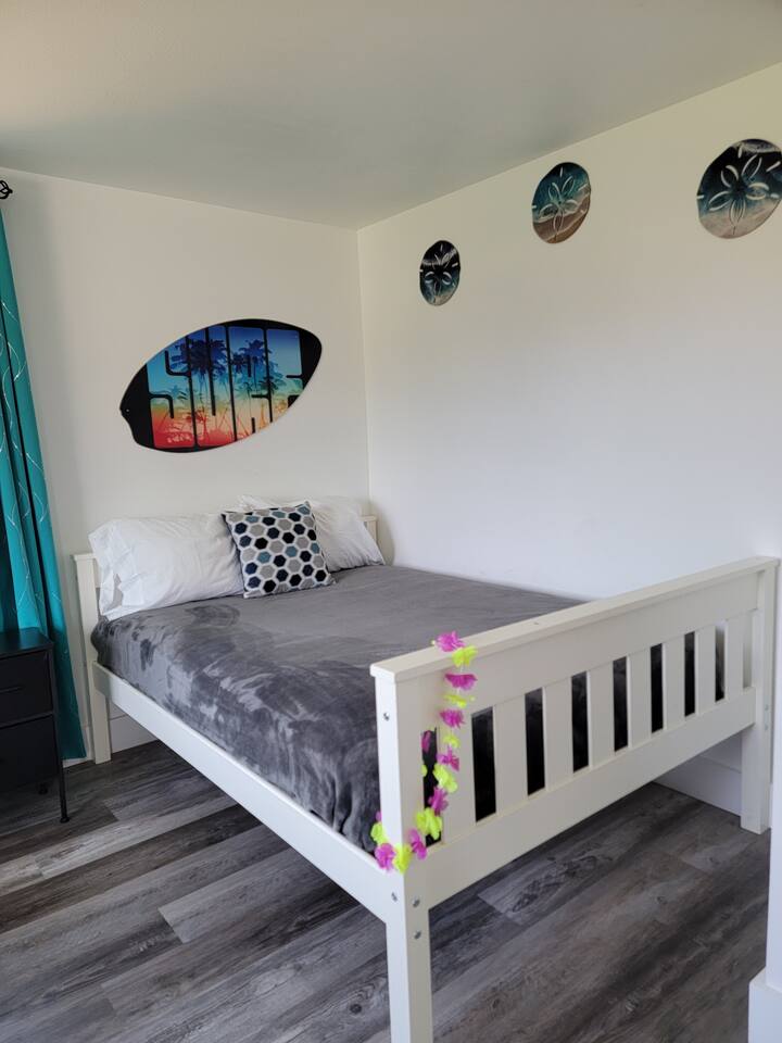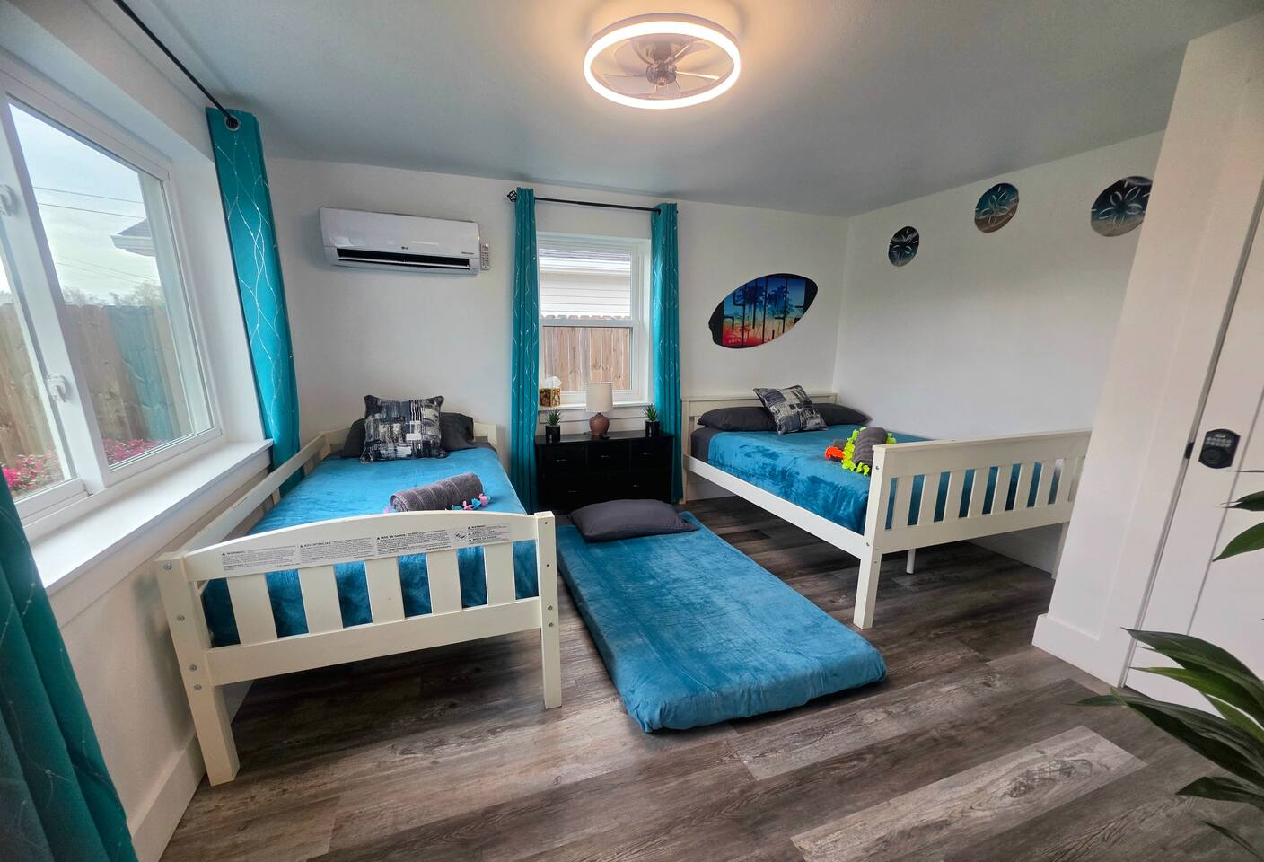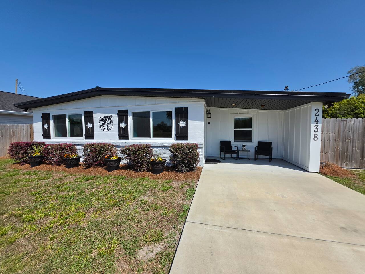 🐢 Turtle Cove Beach Retreat – ⭐ Modern Coastal Cottage in Panama City! 🏡 As You Arrive • Eye-catching modern beach cottage with black, grey, and teal accents • Hand-crafted sea turtle shutters add a local, artistic flair • Lush landscaping with flowers and shrubs creates a welcoming vibe • Ample driveway parking for you and your guests 🛋️ Living Room Open-concept layout flowing into the kitchen • 65" Smart TV and cozy gray sectional with queen memory foam pull-out bed • Large window for natural light and front yard views • Dedicated temperature control for comfort • Decorated with indoor plants and beachy accents 🍽️ Kitchen • Modern with black brushed granite countertops and stainless steel Whirlpool appliances • Unique surfboard light fixture adds coastal character • Chop block floating shelves for storage • Fully stocked for all your cooking needs — from spices to cookware 🛏️ Master Bedroom • Cozy and stylish with a queen memory foam mattress • 50" Smart TV and small work desk • Private temperature control • Decorated with turtle & beach-themed art 🛏️ Guest Bedroom • Two beds, one full and one Twin bed Both have very comfy mattresses • 50" Smart TV with HBO Max included • Private temperature control • Serene turtle and beach decor 🛁 Bathroom • Spacious with a double vanity and modern rain shower & soaking tub • Sleek black fixtures and touch-screen lighted mirror • Recessed lighting and turtle-themed details for a spa-like feel 🧺 Laundry Room & Game Space • Equipped with Samsung front-load washer & dryer • Bonus: Retro arcade machine with 300+ classic games for 1–2 players 🍴 Outdoor Dining Area • Shaded by a sun sail, surrounded by natural greenery and stone • Handmade picnic table under string lights • Propane grill for unforgettable meals 🔥 Outdoor Fireplace • Stone path leads to a cozy firepit with bench seating • Surrounded by privacy fencing for a secluded oasis 🐚 Modern Touches & Local Charm • Thoughtfully designed with modern beach cottage style • Sea turtle theme runs throughout for a fun, local vibe • The perfect escape for relaxation, connection, and memories 📅 Ready to book? Come relax, reset, and enjoy a one-of-a-kind stay at Turtle Cove